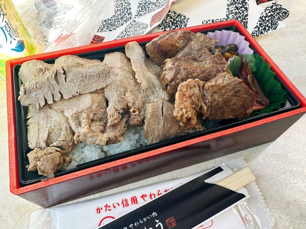 その後、三越で牛タンと牛肉がのったお弁当を買って屋上で食べました。