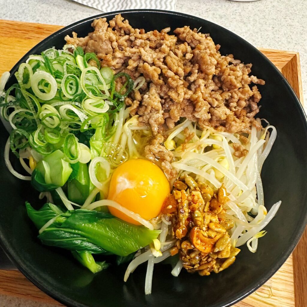 もやしやチンゲンサイ、ネギ、そぼろ、生卵を加えました。