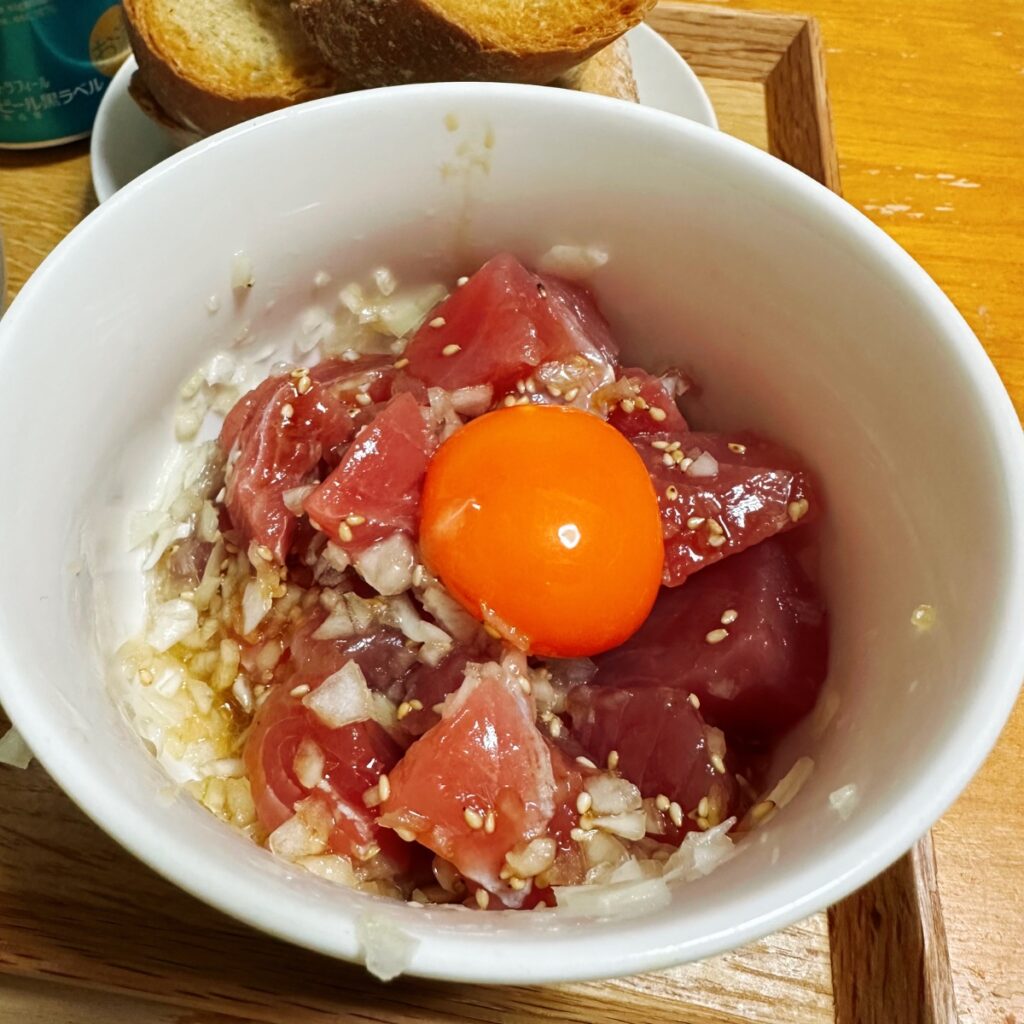今夜の晩酌のつまみは、ホタルイカとキャベツのガーリックバター炒めとマグロと玉ねぎのユッケを作りました。