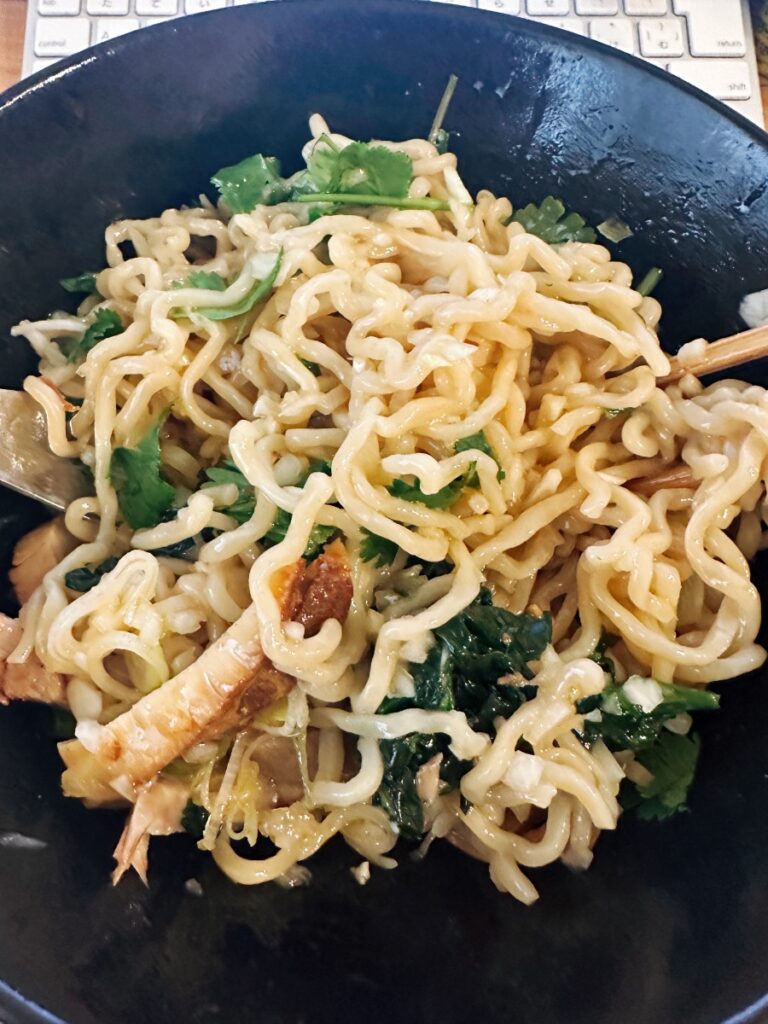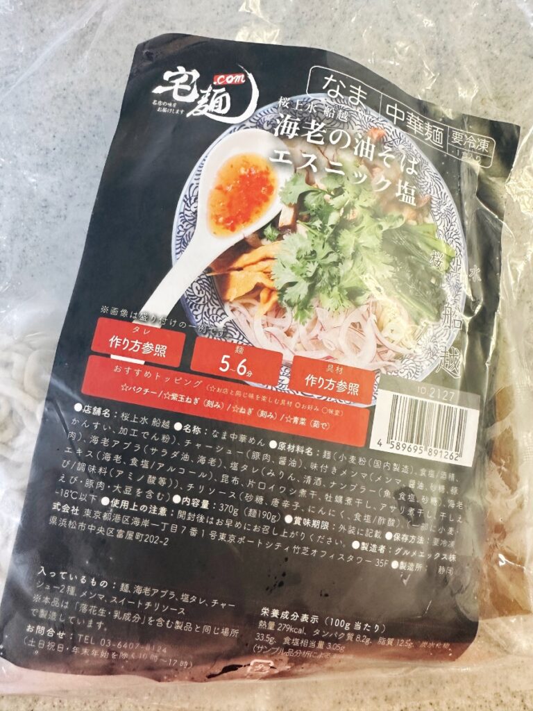 今日のランチは、 #宅麺 の「桜上水 船越 海老の油そば エスニック塩」を食べました。