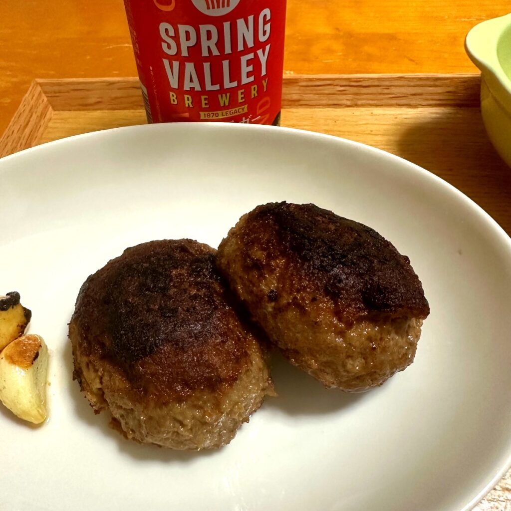 今夜は、お取り寄せしている松阪牛のハンバーグを焼きました。