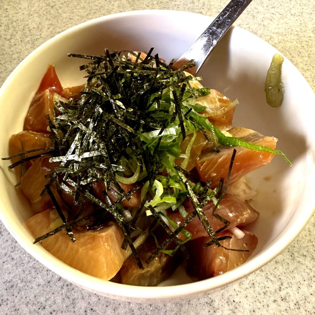 早起きして、体温、血圧、体重をチェックして、昨夜漬けにしておいた刺身の切り落しをご飯にのせて食べました。